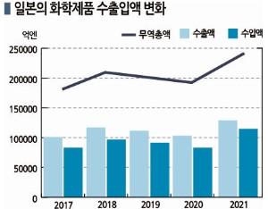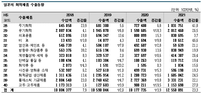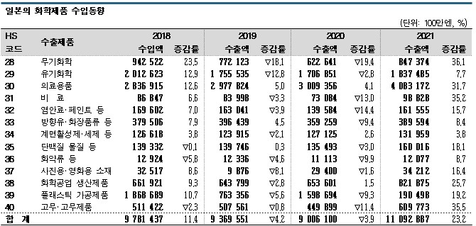 HS코드 28-40번대 화학제품 수출액은 12조5000억엔으로 23.3%, 수입액은 11조929억엔으로 23.2% 급증함으로써 전체 무역총액이 23조6438억엔으로 23.3% 늘었다.