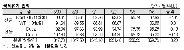 표, 그래프: <국제유가 변화> <화학저널 2022/09/07> |