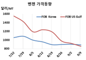 벤젠 시세는 9월8일 FOB Korea가 톤당 885달러로 15달러 하락했고 CFR SE Asia는 975달러로 변동이 없었다. CFR China는 1109달러로 14달러 상승했다.