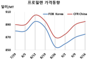 프로필렌 시세는 9월15일 FOB Korea가 톤당 875달러로 5달러, CFR SE Asia는 890달러로 15달러 상승했다. CFR China는 895달러로 5달러, CFR Taiwan은 890달러로 15달러 올랐다.