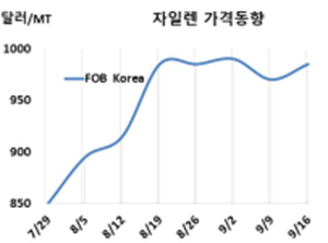용제(Solvent) 그레이드 M-X 시세는 9월15일 FOB Korea가 톤당 985달러로 15달러 상승에 그쳤으나 CFR SE Asia는 1050달러로 30달러 올랐다. CFR China는 1005달러로 15달러 올랐으나 CFR Taiwan은 1000달러로 50달러 급등했다.