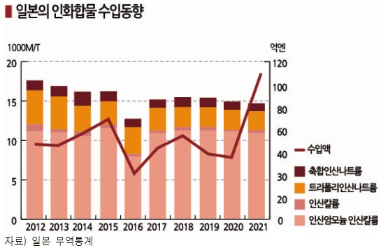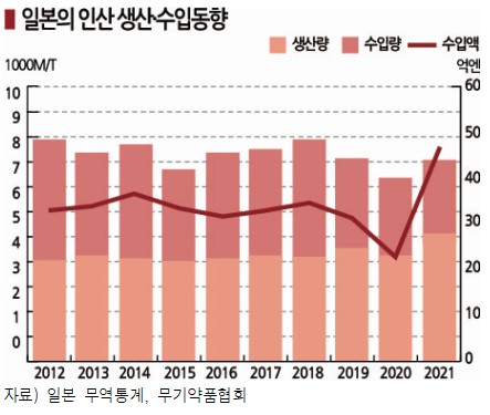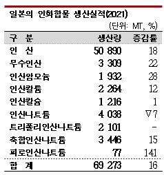 일본은 2021년 인화합물 생산량이 6만9000톤대로 전년대비 16% 증가하며 2010년 7만2000톤에 근접한 것으로 파악된다.