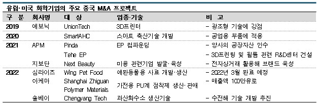 중국 정부가 투자규제를 완화하면서 정밀화학, EP(엔지니어링 플래스틱), 향료 생산기업 인수 프로젝트가 두드러지고 있다.