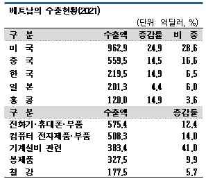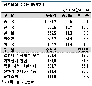 베트남은 조립‧가공기지로 자리 잡고 있어 부품, 원료 등 수입도 안정적인 수준을 유지하고 있으며, 2021년 수입액은 3322억달러로 26.5% 증가해 수출액과 마찬가지로 사상 최고치를 기록했다.
