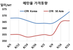 표, 그래프: <Methanol 가격동향> <화학저널 2022/09/30> |