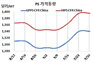 PS(Polystyrene)는 중국 내수가격이 일제히 하락했다. GPPS(General Purpose PS) 시세는 9월26일 CFR China가 톤당 1340달러, CFR SE Asia도 1395달러로 보합세를 형성했다. 표, 그래프: <PS 가격동향> <화학저널 2022/10/06> |