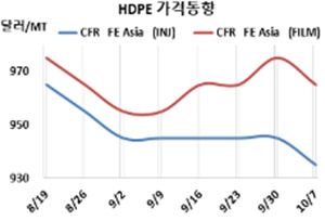 HDPE(High-Density Polyethylene)는 동북아시아만 하락했다. HDPE 시세는 10월5일 인젝션(Injection) 그레이드 기준 CFR FE Asia가 톤당 935달러로 10달러 하락했으나 CFR SE Asia는 1005달러로 변동이 없었고 CFR S Asia는 1135달러로 20달러 상승했다. 표, 그래프: <HDPE 가격동향> <화학저널 2022/10/11> |