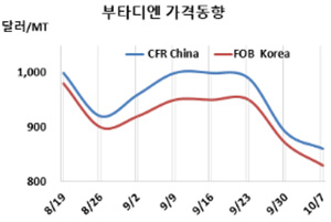 부타디엔(Butadiene)은 하락세가 이어졌다. 부타디엔 시세는 10월6일 FOB Korea가 톤당 830달러로 40달러 하락했고 CFR SE Asia는 750달러로 50달러 급락했다. CFR China와 CFR Taiwan는 860달러로 30달러 떨어졌다. 표, 그래프: <Butadiene 가격동향> <화학저널 2022/10/12> |