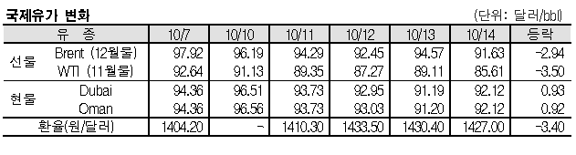 브렌트유, 91.63달러로 2.94달러 떨어져 … 두바이유는 92.12달러