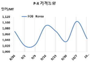 P-X(Para-Xylene)는 폭등과 폭락을 반복하고 있다. P-X 시세는 10월14일 FOB Korea가 톤당 1045달러로 60달러 폭락했고 CFR SE Asia 역시 1045달러로 70달러 폭락했다. CFR Taiwan은 1035달러로 40달러 급락했다. 표, 그래프: <P-X 가격동향> <화학저널 2022/10/20> |