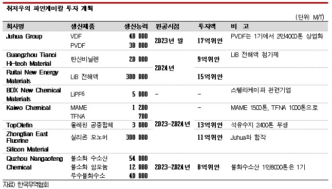 중국이 파인케미칼 투자를 본격화하고 있다. LiB 소재 메이저인 Guangzhou Tianci Hi-tech Material은 자회사를 통해 취저우에서 탄산비닐렌을 사업화한다. 탄산비닐렌은 전해액에 첨가하는 용도로 사용되며 2024년 완공을 목표로 2단계에 걸쳐 2만톤 플랜트를 건설할 예정이다. 표, 그래프: <취저우의 파인케미칼 투자 계획> <화학저널 2022년 10월 31일> |