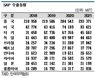 글로벌 SAP 수요는 2021년 약 300만톤으로 2020년과 비슷한 수준을 유지한 것으로 추정된다.