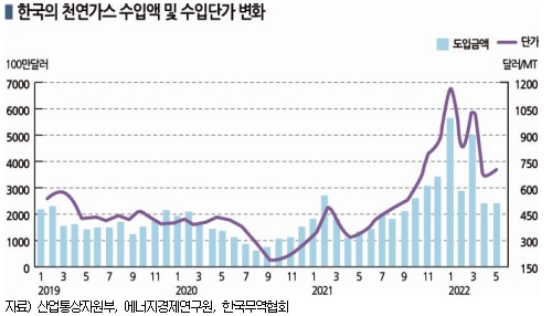 한국무역협회에 따르면, 2021년에는 천연가스 4593만톤을 수입했으며 수입단가는 톤당 554달러, 100만btu당 약 10.7달러를 형성한 것으로 나타났다. 2022년 1-7월 수입량은 2603만톤으로 전년동기대비 4.1% 감소했으며 수입단가는 톤당 914달러, 100만btu당 약 17.6달러로 폭등한 것으로 파악된다.