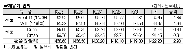 브렌트유, 94.65달러로 1.84달러 올라 … 두바이유는 91.44달러로