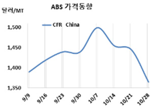 ABS(Acrylonitrile Butadiene Styrene)는 폭락세를 재연했다. ABS 시세는 10월26일 CFR China가 1365달러로 80달러 대폭락했고 CFR SE Asia도 1400달러로 50달러 폭락했다. 그러나 CFR S Asia는 1515달러로 변동이 없었다. 표, 그래프: <ABS 가격동향> <화학저널 2022/11/02> |