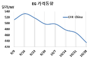 MEG 시세는 10월28일 CFR China가 톤당 438달러로 30달러 급락했고 CFR SE Asia도 448달러로 30달러 떨어졌다. 표, 그래프: <EG 가격동향> |