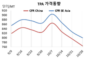 PTA 시세는 10월28일 CFR China가 톤당 765달러로 30달러 하락했고 CFR SE Asia도 800달러로 25달러 떨어졌다. CFR China는 2022년 1월28일 톤당 775달러를 형성한 이후 최저치를 갱신했다. 표, 그래프: <TPA 가격동향> |