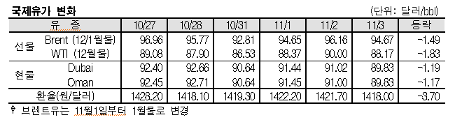 11월3일 국제유가는 미국 연준(Fed) 통화정책회의 여파 등으로 하락했다.