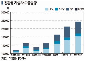 특히, 2022년 상반기 전기자동차 내수판매는 6만7604대로 71.0%, 7월에는 1만4708대로 102.9% 폭증한 것으로 나타났다. 2022년 1-7월 하이브리드자동차와 전기자동차 수출도 각각 16만647대, 11만6387대로 34.0%, 56.2% 급증했으며 7월 수출액은 11억달러에 달했다.