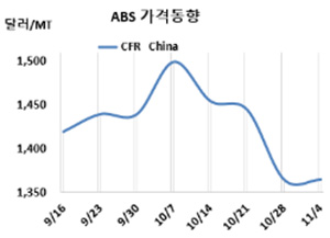 ABS(Acrylonitrile Butadiene Styrene)는 인디아만 하락했다. ABS 시세는 11월2일 CFR China가 1365달러, CFR SE Asia는 1400달러로 변동이 없었으나, CFR S Asia는 1485달러로 30달러 급락했다. 표, 그래프: <ABS가격동향> <화학저널 2022/11/09> |