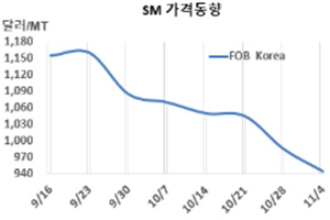 SM(Styrene Monomer)은 하락세를 계속했다. SM 시세는 11월4일 FOB Korea가 톤당 945달러로 40달러 하락했고 CFR SE Asia도 970달러로 25달러 내려갔다. CFR China와 CFR Taiwan도 940달러로 15달러 떨어졌다. 표, 그래프: <SM 가격동향> <화학저널 2022/11/09> |