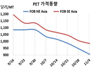 병(Bottle) 그레이드 PET 시세는 11월2일 FOB NE Asia가 905달러로 40달러 급락했고 FOB SE Asia 역시 985달러로 20달러 하락하며 1000달러가 무너졌다. 특히, CFR S Asia는 990달러로 110달러 대폭락하며 1000달러가 붕괴됐다.
