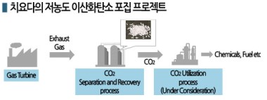 치요다(Chiyoda)는 가스화력 발전소의 배기가스에 적합한 이산화탄소 포집기술을 개발하고 있다.