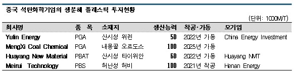 생분해성 수지 PBAT(Polybutylene Adipate-co-Terephthalate), PBS(Polybutylene Succinate) 프로젝트도 다수 진행되고 있다. 석탄 베이스 아세틸렌과 포름알데히드로 제조하는 1,4-BDO(Butanediol)를 원료로 이용할 수 있기 때문이다.