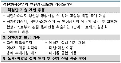 가이드라인은 보급이 시급한 성숙기술로 에너지 계통 최적화와 폐열 이용, 이산화탄소 등 폐기물의 종합적인 이용을 강조하고 있으며 이산화탄소 포집‧저장‧이용(CCUS) 활용, 이산화탄소 베이스 기초화학 원료 및 생분해성 플래스틱 사업화를 지원할 방침이다.