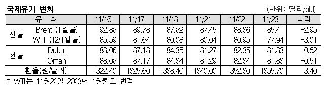 화학뉴스 2022.11.24 11월23일 국제유가는 러시아산 공급 우려가 완화된 영향으로 폭락했다.