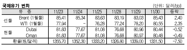 11월30일 국제유가는 글로벌 공급 차질 우려가 심화됨에 따라 급등했다. 미국 원유 재고 급감과 러시아산 원유 가격 상한제 영향으로 글로벌 공급 차질 우려가 심화되고 있다. 표, 그래프: <국제유가 변화> <화학저널 2022/12/01> |