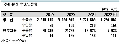한국무역협회에 따르면, 황산 수출량은 2019년부터 2021년까지 250만-300만톤 수준을 나타냈고 2022년 상반기에는 129만4082톤으로 전년동기대비 1.9% 감소했다.