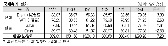 12월6일 국제유가는 경기침체 우려로 폭락했다. 미국 주요 투자은행들이 인플레이션에 따른 소비 위축 등으로 2023년 경기침체 가능성을 경고했다. 표, 그래프: <국제유가 변화> <화학저널 2022/12/07> |