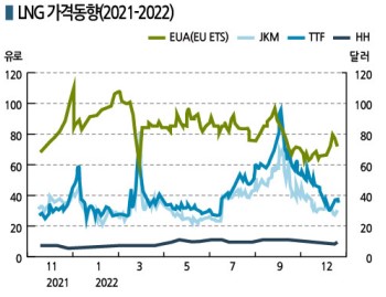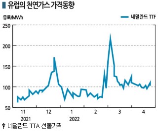 유럽 천연가스 가격지표인 네덜란드 TTF는 2021년 가을부터 수급타이트가 심화돼 12월 MWh당 184유로로 급등했고 2022년 초 러시아의 우크라이나 침공으로 3월 사상 최고치인 227유로에 달했다.
