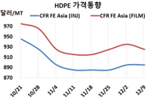 HDPE(High-Density Polyethylene)는 동남아시아만 하락했다. HDPE 시세는 12월7일 인젝션(Injection) 그레이드 기준 CFR FE Asia가 톤당 895달러로 보합세를 형성했으나 CFR SE Asia는 935달러로 10달러 하락했다. CFR S Asia는 995달러로 변동이 없었다. 표, 그래프: <HDPE 가격동향> <화학저널 2022/12/12> |