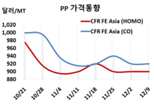 PP(Polypropylene)는 동남아시아만 상승했다. 아시아 PP 시세는 12월7일 CFR FE Asia 기준 라피아(Raffia) 및 인젝션(Injection) 그레이드가 톤당 900달러, IPP Film 및 BOPP는 910달러, 블록 코폴리머(Block Copolymer)는 920달러로 변동이 없었다. 표, 그래프: <PP 가격동향> <화학저널 2022/12/13> |