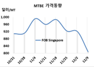 MTBE(Methyl tert-Butyl Ether)는 갑자기 폭락했다. MTBE 시세는 12월8일 FOB Singapore 톤당 807달러로 113달러 폭락했다. 표, 그래프: <MTBE 가격동향> <화학저널 2022/12/16> |