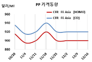 아시아 PP 시세는 12월14일 CFR FE Asia 기준 라피아(Raffia) 및 인젝션(Injection) 그레이드가 톤당 900달러, IPP Film 및 BOPP는 910달러, 블록 코폴리머(Block Copolymer)는 920달러로 변동이 없었다.
