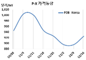 P-X(Para-Xylene)는 오랜만에 상승했다. P-X 시세는 12월16일 FOB Korea가 톤당 925달러로 30달러 상승했고 CFR SE Asia도 925달러로 20달러 올랐다. CFR Taiwan 역시 940달러로 30달러 상승했다. 표, 그래프: <P-X 가격동향> <화학저널 2022/12/22> |
