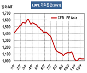 LDPE(Low-Density Polyethylene)는 2022년 중국 영향이 극대화됐다. LDPE 시세는 12월23일 필름 그레이드 기준 CFR FE Asia가 톤당 1030달러로 변동이 없었고 CFR SE Asia는 1080달러로 10달러 상승했다. CFR India는 1100달러로 20달러 올랐다. 표, 그래프: <LDPE 가격동향> <화학저널 2023/01/02> |