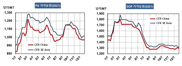 DOP(Dioctyl Phthalate)는 12월30일 CFR China 1290달러로 20달러 하락했고 CFR SE Asia도 1310달러로 20달러 떨어졌다.