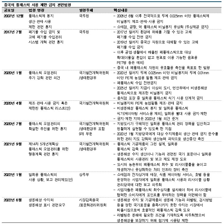 중국 정부는 2022년 1월 일회용 플래스틱 사용 관리 및 보고 관련제도 초안을 발표하고 6월 생분해성 수지의 국가 표준제도를 공포했다.