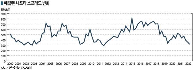 에틸렌-나프타 스프레드는 2000년 1분기부터 2022년 3분기까지 최대 820달러에서 최소 146달러를 오갔고 평균값은 413달러, 중간값은 376달러를 나타냈다.