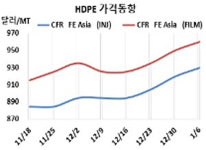 HDPE(High-Density Polyethylene)는 상승세를 이어갔다. HDPE 시세는 1월4일 인젝션(Injection) 그레이드 기준 CFR FE Asia가 톤당 930달러로 10달러, CFR SE Asia는 980달러로 5달러 상승했다. 특히, CFR S Asia는 1060달러로 35달러 폭등했다. 표, 그래프: <HDPE 가격동향> <화학저널 2023/01/09> |