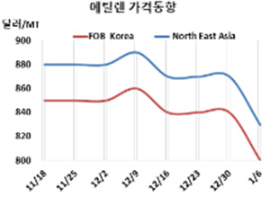 에틸렌(Ethylene)은 새해 출발부터 급락했다. 에틸렌 시세는 2023년 1월6일 CFR NE Asia가 톤당 830달러로 40달러 급락했고 CFR SE Asia는 880달러로 30달러 하락했다. FOB Korea는 톤당 800달러로 40달러 급락했다. 표, 그래프: <Ethylene 가격동향> <화학저널 2023/01/10> |