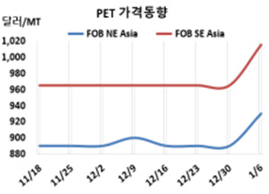 PET(Polyethylene Terephthalate)는 오랜만에 상승했다. 병(Bottle) 그레이드 PET 시세는 1월4일 FOB NE Asia가 930달러로 40달러, FOB SE Asia는 1015달러로 50달러 급등했다. CFR S Asia도 990달러로 30달러 상승했다. 표, 그래프: <PET 가격동향> <화학저널 2023/01/12> |