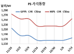GPPS(General Purpose PS) 시세는 1월11일 CFR China가 1175달러로 10달러 상승했고 CFR SE Asia도 1200달러로 10달러 올랐다. CFR India는 1235달러로 20달러 상승했다.