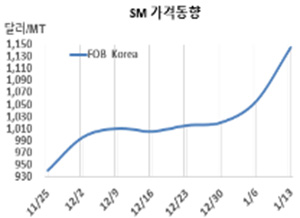 SM(Styrene Monomer)은 갑자기 폭등했다. SM 시세는 1월13일 FOB Korea가 톤당 1145달러로 90달러, CFR SE Asia도 1175달러로 90달러 폭등했다. CFR China와 CFR Taiwan도 1145달러로 90달러 폭등했고, CFR India 역시 1235달러로 80달러 폭등했다. 표, 그래프: <SM 가격동향> <화학저널 2023/01/18> |
