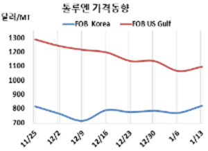 톨루엔(Toluene)은 갑자기 급등했다. 톨루엔 시세는 1월13일 FOB Korea가 톤당 820달러로 50달러 급등했고 CFR SE Asia는 880달러로 35달러 상승했다. CFR China와 CFR Taiwan는 840달러로 55달러 급등했다. 표, 그래프: <톨루엔 가격동향> <화학저널 2023/01/18> |