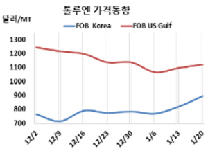 FOB Korea 895달러로 75달러 치솟아 … 유럽은 1105달러 형성